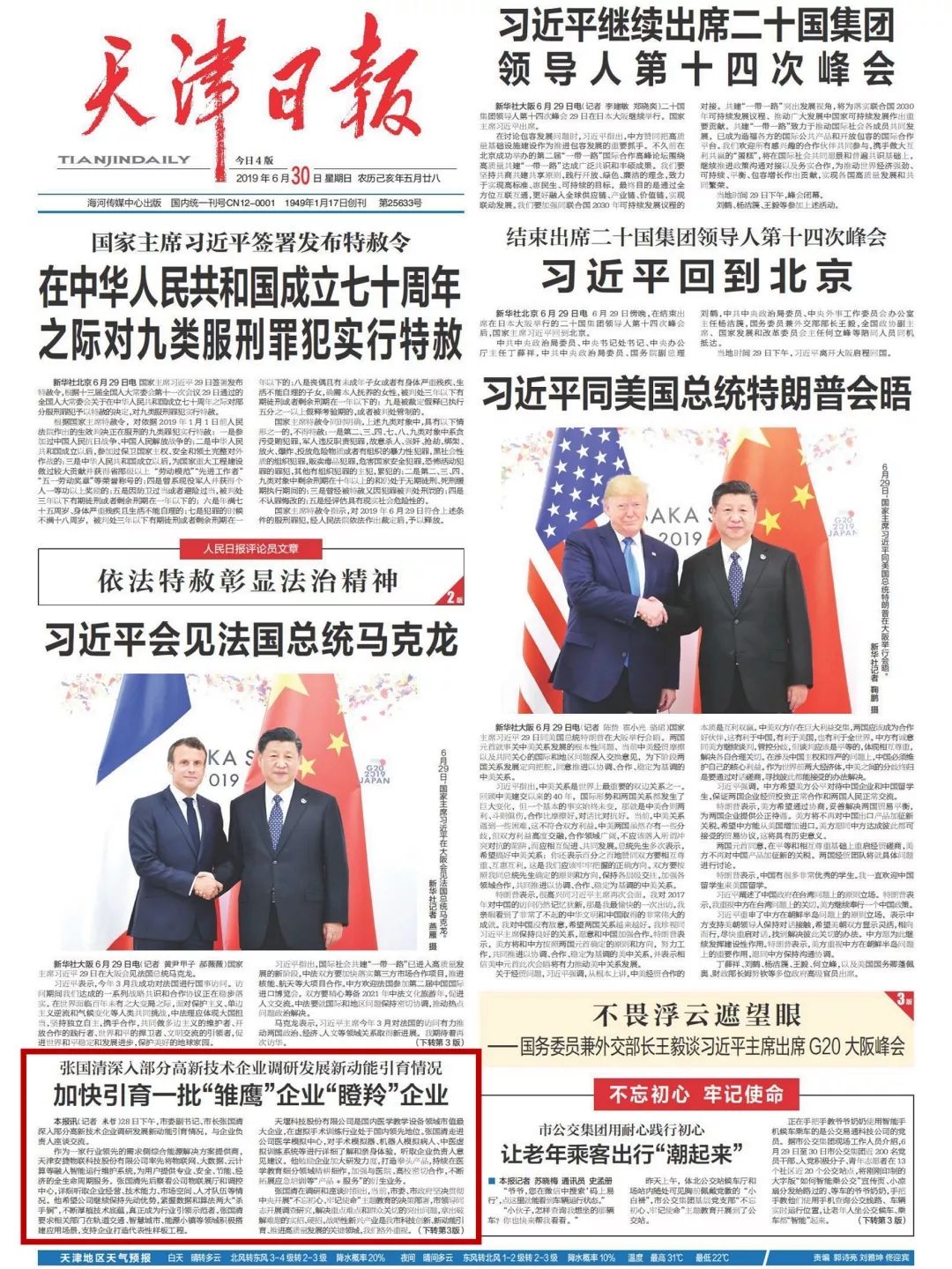 2019年6月28日,天津市委副书记、市长(时任)张国清莅临天津星空xingkong电竞物联科技股份有限公司考察指导,深度调研高新技术企业发展新动能引育情况,并与企业负责人座谈交流。天津市科技局局长戴永康、市发改委副主任魏广勇、市工信局副局长王云齐陪同考察。星空xingkong电竞物联董事长刘柏呈,执行董事庞文魁,董事王涛,副总裁杨鸥全程讲解。