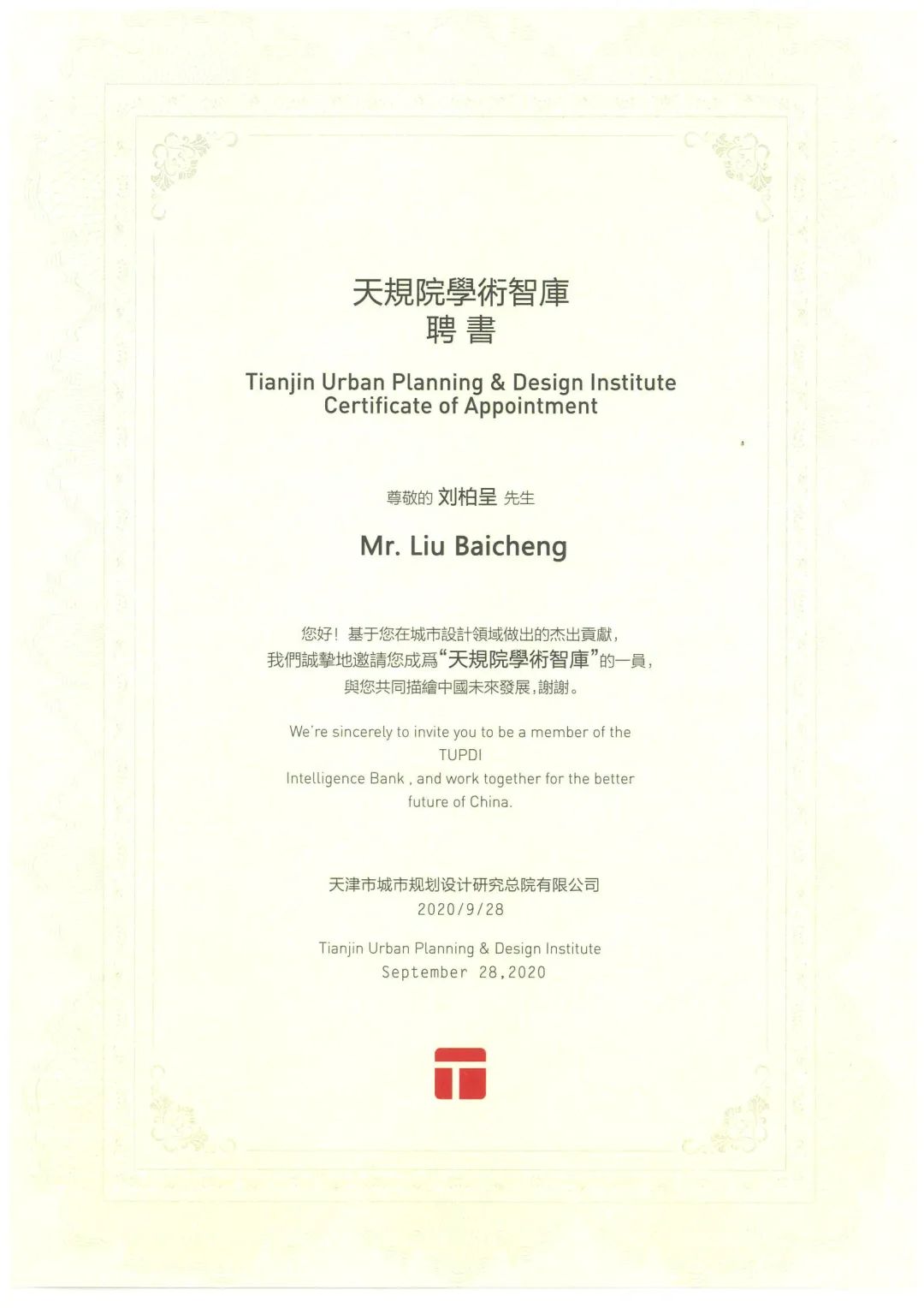 天规院学术智库聘书