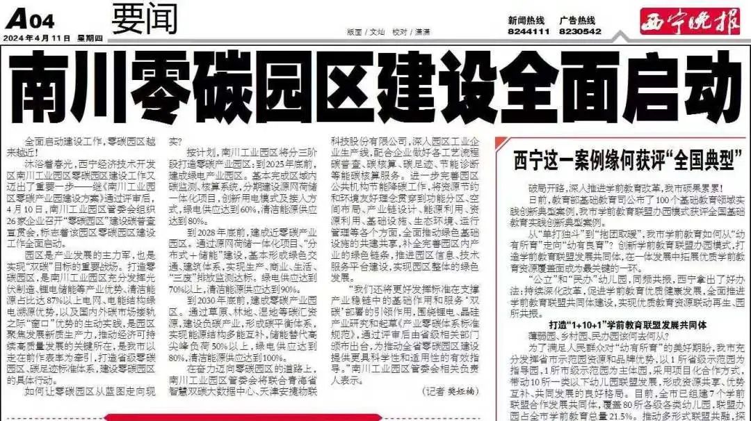 2024年4月,西宁晚报刊登文章《南川零碳园区建设全面启动》,其中提到:在奋力迈向零碳园区的道路上,南川工业园区管委会将联合青海省智慧双碳大数据中心、天津星空xingkong电竞物联科技股份有限公司,深入园区工业企业生产线,配合企业做好各工艺流程碳普查、碳核算、碳足迹、节能诊断等能碳核算服务。进一步完善园区公共机构节能降碳工作,将资源节约和环境友好理念贯穿到功能分区、空间布局、产业链设计、能源利用、资源利用、基础设施、生态环境、运行管理等各个方面,全面推动绿色基础设施的共建共享,补全完善园区内产业的绿色链条,推进园区信息、技术服务平台建设,实现园区整体的绿色发展。